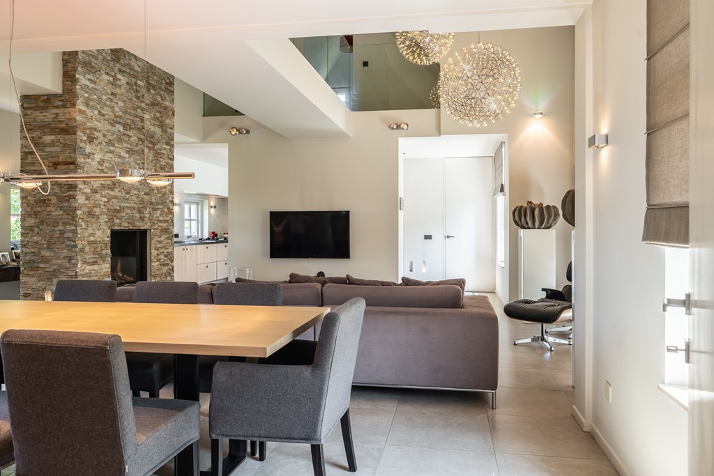 De woonkamer is voorzien van een keramische tegelvloer met vloerverwarming, inbouwverlichting, plafondverwarming en een gashaard. Door de grote glasgevel aan de achterzijde van het huis komt er veel natuurlijk lichtinval de woning binnen. Dankzij de grote glasgevel staat u vanuit de woonkamer altijd in verbinding met de tuin.